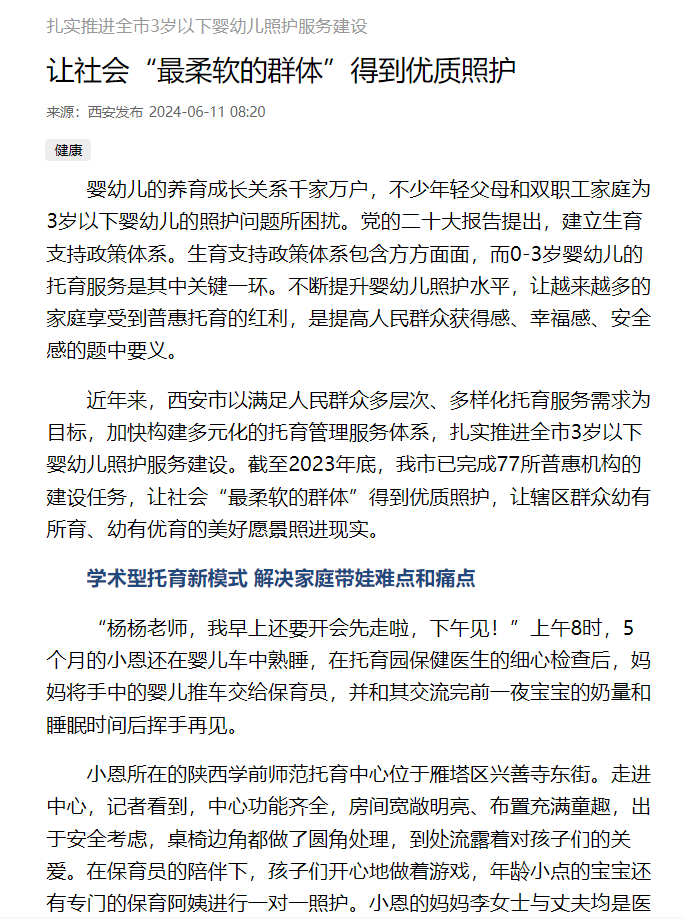 2024年6月11日,《西安晚报》以《让社会“最柔软的群体”得到优质照护》为题,对best365官网托育中心进行宣传报道。新闻稿对best365官网托育中心做了详细的介绍,以学术型托育新模式,解决家庭带娃难点和痛点——陕西学前师范托育中心为例,肯定了专业高校创办公办普惠型托育园在探索“幼有所育”这一民生事业中的成功案例。 “幼有所育、学有所教”。托育服务发展是重要的民生工程,best365官网科教产业公司将依托学校专业群,充分发挥自身资源优势,聚焦托幼产业,共建多元联动的行业发展平台、区域人才培养共同体,建设托幼产学研服务资源库,发展托育人才职业技能培训网络,助力地市托幼一体化实践,实现政府决策——学校教育——企业运营——家庭需求的精准对接和良性互动,为陕西乃至西北地区建设高质量托幼公共服务体系贡献力量。 (供稿:科教产业公司 撰稿:卢瑞 责任审核:马云)