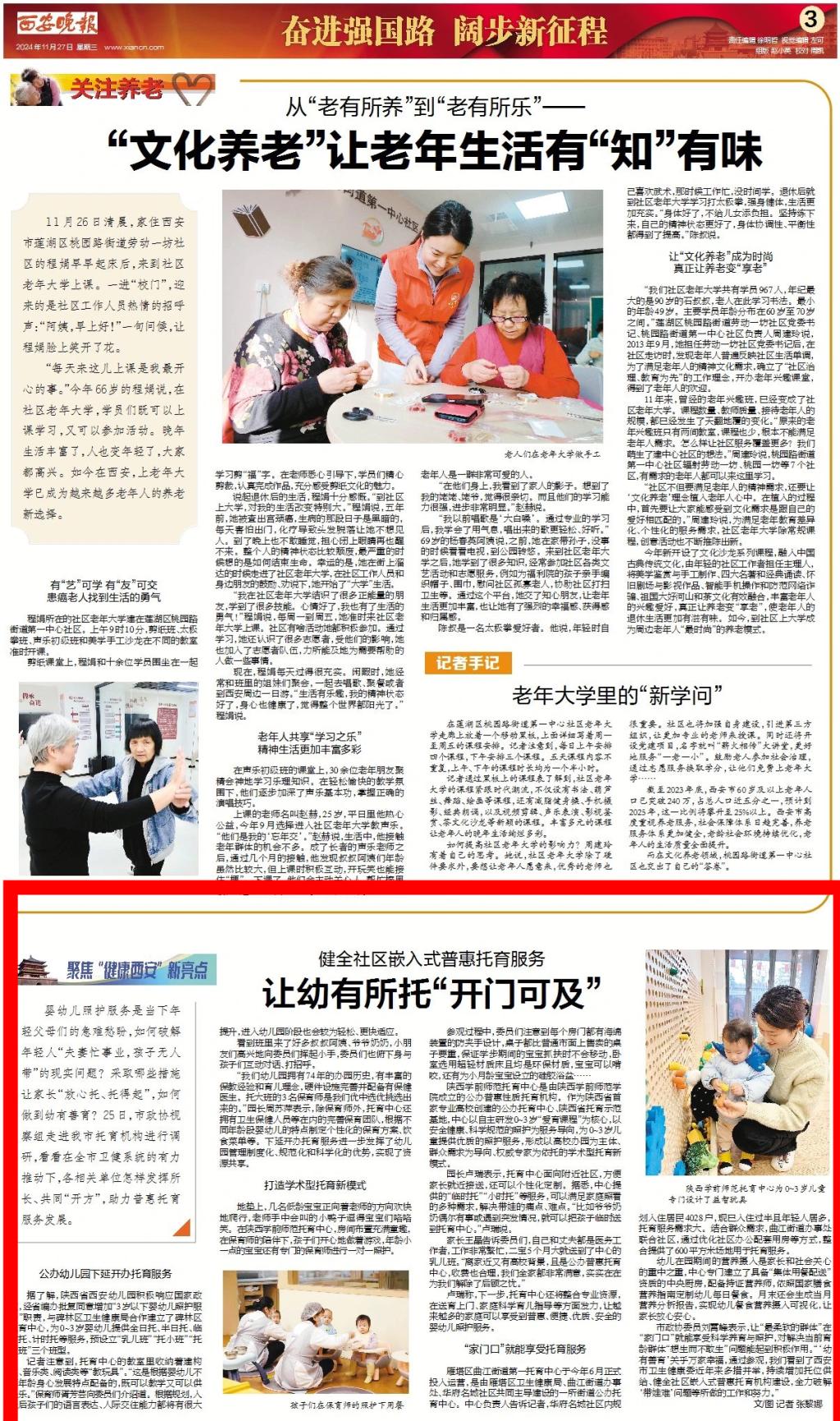 《西安晚报》以《让幼有所托“开门可及”》为题,对best365官网托育中心进行了深入报道。记者用生动的笔触描绘了托育中心的环境设施、教育理念以及和孩子们在这里的快乐生活。同时,详细介绍了best365官网托育中心以专业高校为主题打造学术型托育新模式的做法和经验。