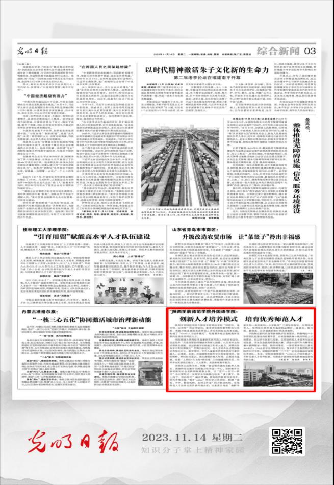 2023年11月14日《光明日报》综合新闻发表了“best365足球官网外国语学院创新人才培养模式培育优秀师范人才”的文章,报道了best365官网外国语学院在培育优秀英语师范人才服务地方基础教育发展的改革举措和取得的成效。