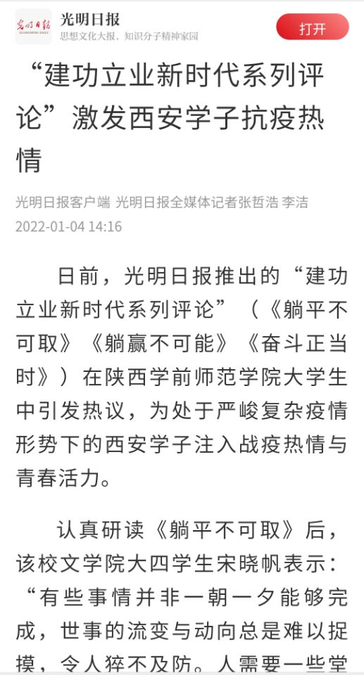 2021年12月27—29日《光明日报》推出的“建功立业新时代系列评论”(《躺平不可取》《躺赢不可能》《奋斗正当时》)在best365足球官网大学生中引发热议,为处于严峻复杂疫情形势下的西安学子注入战疫热情与青春活力。