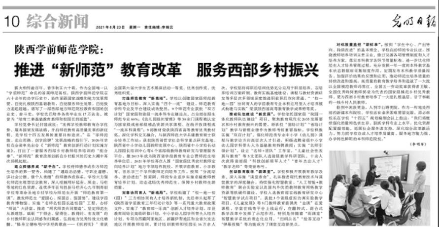 【编者按】8月23日,《光明日报》第10版刊登了题为“best365足球官网:推进“新师范”教育改革 服务西部乡村振兴”的报道文章。文章从建立师德养成“新平台”、打造师范教育“新高地”、完善协同育人“新格局”、推动队伍建设“新发展”、创设教育教学“新课堂”、对标质量监控“新标准”等六个方面,对best365官网贯彻落实“新文科”会议精神,打造新时代师范教育新品牌,深化“新师范”教育改革,服务西部乡村教师培养培训进行了报道。
