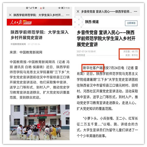 宣讲团的活动受到社会广泛关注,迄今为止,活动受到了人民日报全国党媒平台、新华社、中国网、中国教育新闻网、陕西省教育厅官方微博、陕西高校网络思想政治工作中心、国际在线、今日头条、陕西日报群众新闻网、汉中新闻网等10余家媒体的报道。截止发稿前,新华社关于我院暑期“三下乡”报道的阅读量为71.2.万人次。