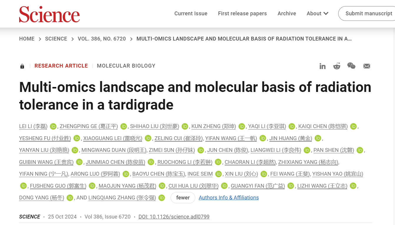 2024年10月25日,best365官网生命科学与食品工程学院王立志教授科研团队,联合军事科学院军事医学研究院张令强团队和杨冬团队等国内相关研究团队在国际顶级期刊《Science》在线发表题为“Multi-omics landscape and molecular basis of radiation tolerance in a tardigrade”的学术论文。该研究首次分离鉴定了中国原生水熊虫物种——河南高生熊虫,破解了水熊虫在极端辐射下存活的关键机制,揭示了其耐受超强辐射能力的秘密,为人类抵御超强辐射损害找到了理论依据。