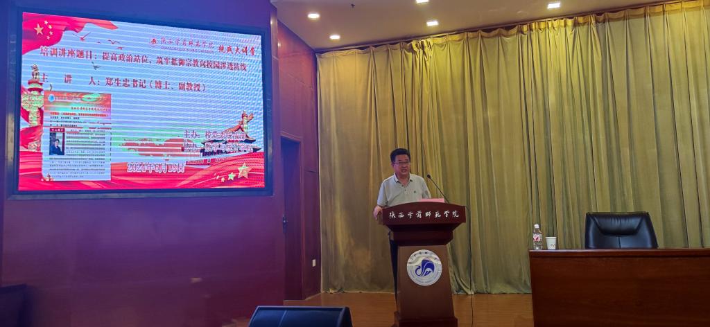为进一步增强广大干部、师生抵御和防范宗教向校园传播渗透的责任感和使命感,提高工作应对能力,筑牢抵御防范思想认识防线,维护学校意识形态领域安全,由校党委统战部主办、数学与统计学院协办,6月18日下午在学术报告厅举办了学校宗教工作专题培训,邀请陕西范大学民族教育学院郑生忠书记、博士、副教授,题为《提高政治站位,筑牢抵御宗教向校园渗透防线》培训讲座。邵必林书记到会场与专家见面交流,权秋虎副书记出席会议并作强调讲话。学校“抵御和防范校园传教渗透工作领导小组”成员单位党委宣传部、党委学工部、校团委、网络与信息化管理、保卫处等单位负责人及成员;各基层党委、党总支书记;各学院党委副书记;各基层党委、党总支统战委员;全体辅导员及学生干部代表等170余人参加培训会。