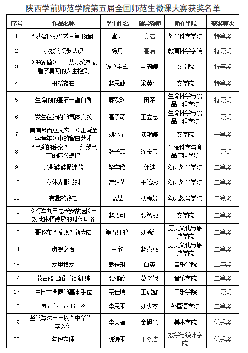 近日,在刚刚结束的第五届全国师范生微课大赛中,best365官网学子喜获佳绩。学校推荐的20项作品全部获奖,其中特等奖5项、一等奖3项、二等奖10项、优秀奖2项。教育科学学院高洁等5位教师荣获优秀指导教师,学校再次荣获“优秀组织单位”称号,获奖数量和质量再创新高。