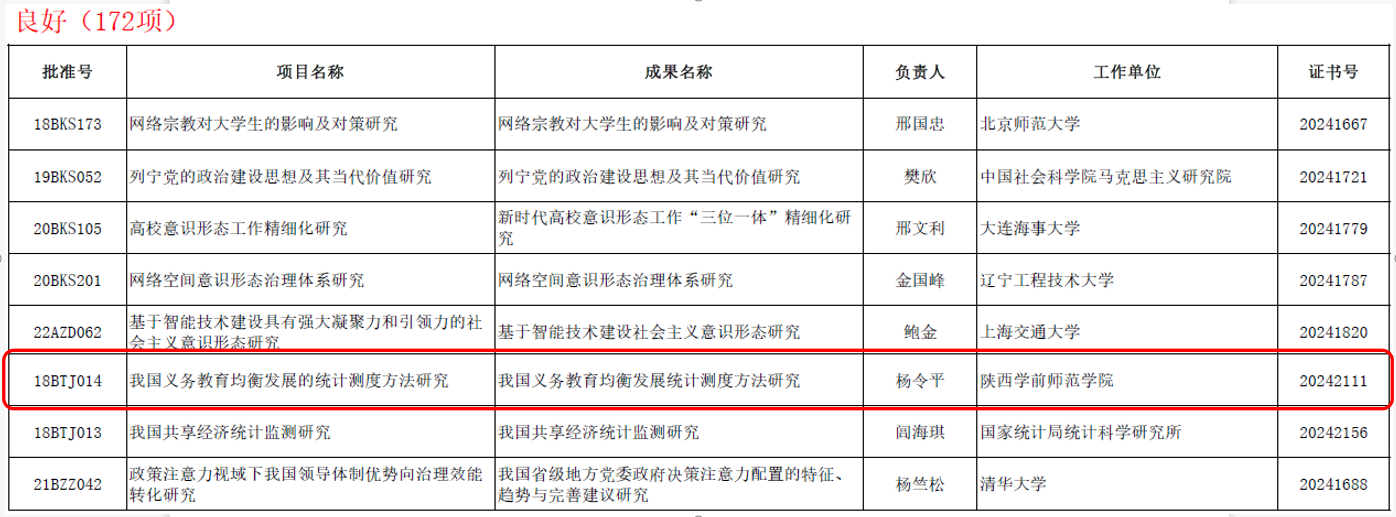 近日,全国哲学社会科学工作办公室公布了《2024年5月国家社科基金年度项目、青年项目和西部项目结项情况》,best365官网杨令平教授主持的国家社科基金项目“我国义务教育均衡发展的统计测度方法研究”获专家一致好评,结项鉴定为“良好”等级。 据悉,国家社科基金项目对成果质量要求高,结项审核严格。本次国家社科基金规划办共验收601个年度项目、青年项目和西部项目结项申请,经同行专家鉴定,495个项目予以结项;48项获评“优秀”等级,优秀率7.99%;172项获评“良好”级别,良好率28.62%;106项未通过,未通过率17.63%。 近年来,学校高度重视国家级项目的申报和结项工作,加强对获批项目的过程管理和跟踪服务,取得了较好效果,项目结项质量稳步提升。 (供稿:学科建设与科研处 撰稿:李浩 责任审核:邢兰芹)