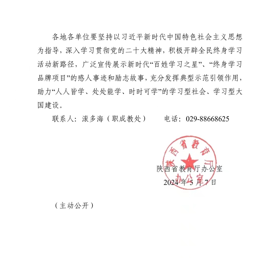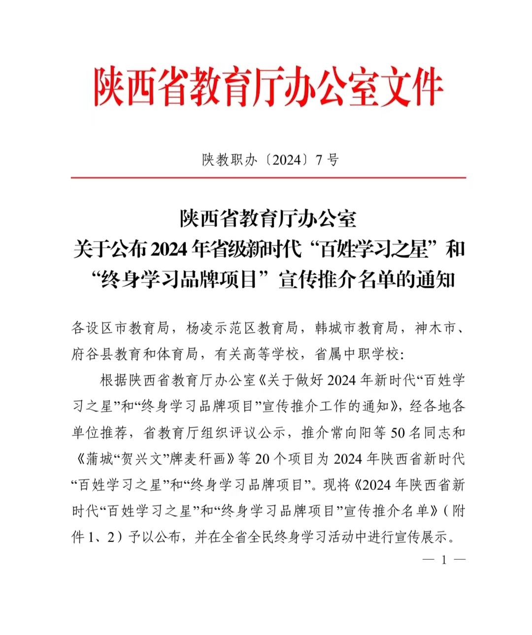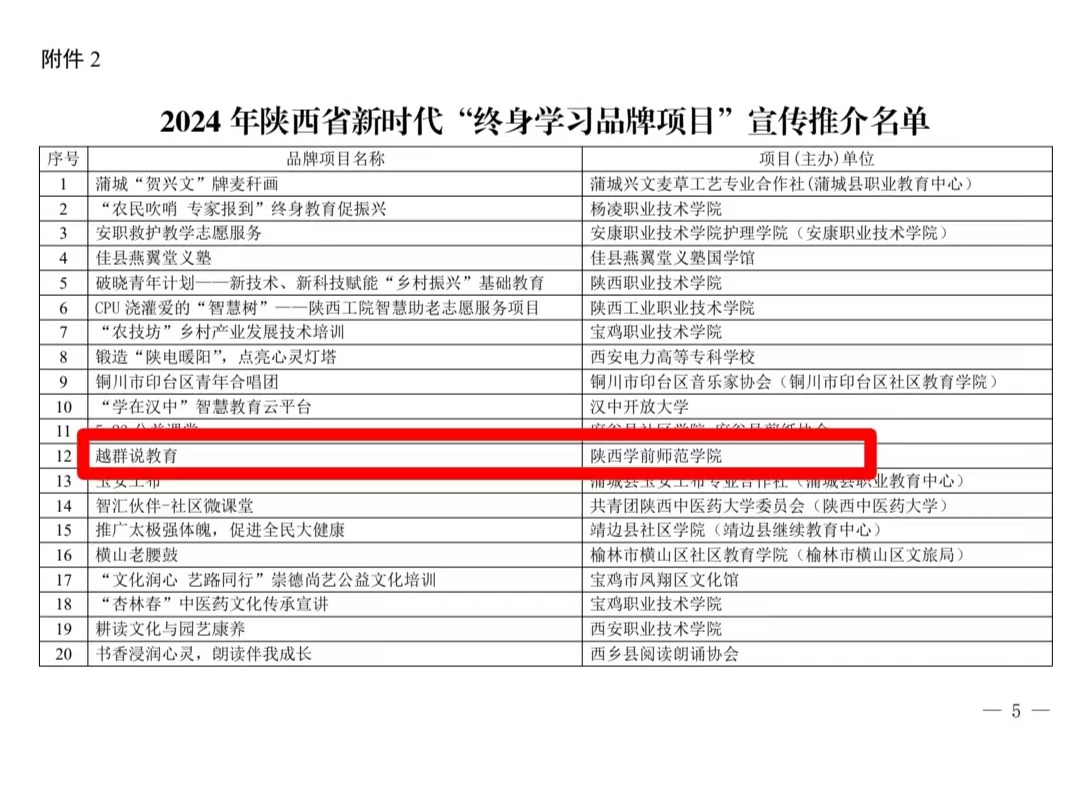 近日,陕西省教育厅下发《陕西省教育厅办公室关于公布2024年省级新时代“百姓学习之星”和“终身学习品牌项目”推介名单的通知》,best365官网王越群教授主持的“越群说教育”项目荣获陕西省新时代“终身学习品牌项目”称号。这是best365官网在学习型校园创建活动中,继一名教师荣获“百姓学习之星”称号之后取得的又一项成果。