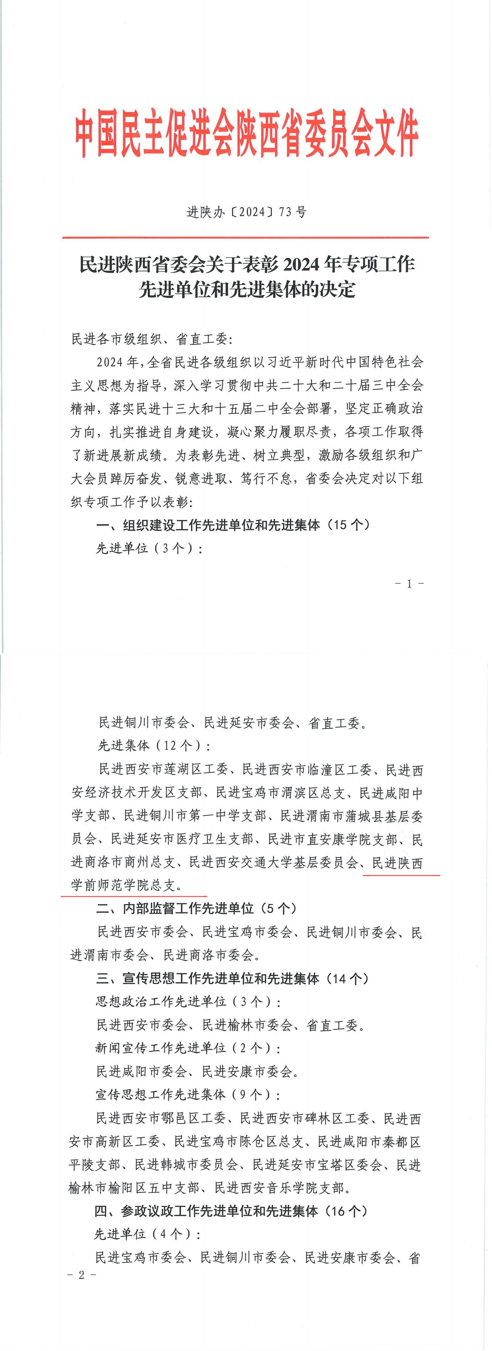 近日获得喜讯,best365官网民进总支委员会等12个基层组织因工作突出,各项工作取得了新进展新成绩,被民进陕西省委会授予2024年“组织建设工作先进集体”荣誉。