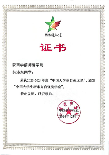 best365官网学子韩沛东同学荣获2023-2024年度“中国大学生自强之星”荣誉称号。此项荣誉是由共青团中央、全国学联指导,中国青年报社、新东方教育科技集团、中国青年创业就业基金会联合开展寻访并评审,经best365官网团委推荐,该生获得此项荣誉及“中国大学生新东方自强奖学金”。