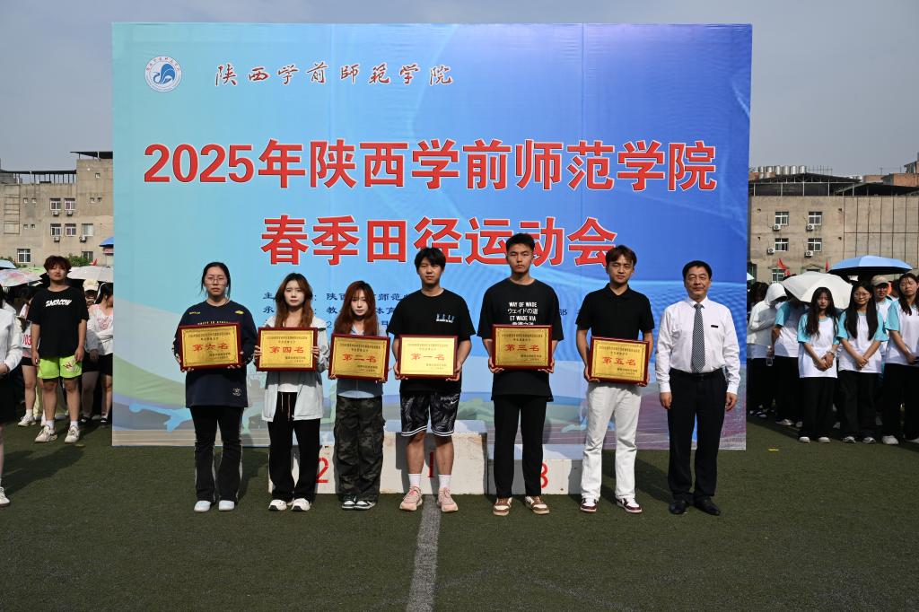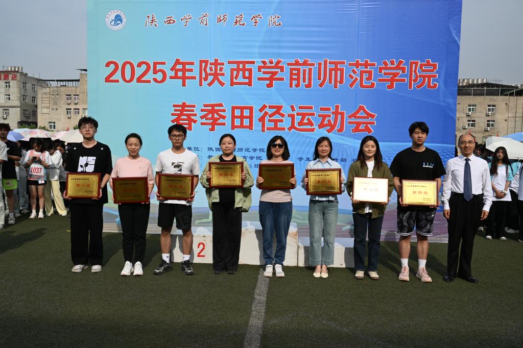闭幕式上,组委会宣布了本届运动会团体总分排名及体育道德风尚奖获奖单位。幼儿教育学院获得学生甲组团体总分第一名,教育科学学院、信息工程学院、数学与统计学院、音乐学院、人文学院分获二到六名;学生组前三名分别是22级体育教育女队、24级体育教育女队和24级体育教育1班;幼儿教育学院、马克思主义学院、外国语学院;音乐学院、美术学院、生命食品与化学学院、经济与管理学院获得开幕式风采展示奖;教工组团体总分第一名是信息工程学院分会,获得二到八名的分别是机关三党委分会、外国语学院分会、生物食品与化学学院分会、马克思主义学院分会、人文学院分会、音乐学院分会和幼儿教育学院分会;教工组的生物食品与化学学院分会、马克思主义学院分会获得体育道德风尚奖;信息工程学院分会、机关三党委分会、外国语学院分会获得了优秀组织奖。校领导为获奖集体颁发奖牌,全场掌声雷动,向拼搏者致敬。