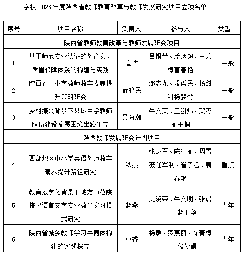 近日,陕西省教育厅公布了2023年度陕西省教师教育改革与教师发展研究项目立项名单,best365官网6个项目获批立项,其中重点项目1项,一般项目3项,青年项目2项。