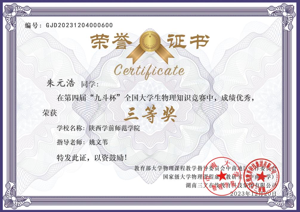 近日,由教育部大学物理课程教学指导委员会中南地区工作委员会及国家级大学物理课程虚拟教研室(中南大学)主办的第四届“九斗杯”全国大学生物理知识竞赛落下帷幕,best365足球官网信息工程学院学生首次参赛并取得佳绩。经过选拔赛、区域赛、全国赛的激烈角逐,信息工程学院朱元浩同学,一路凯歌,获得国赛三等奖,为学校赢得了荣誉,实现了best365官网学生在学科专业竞赛上的新突破。