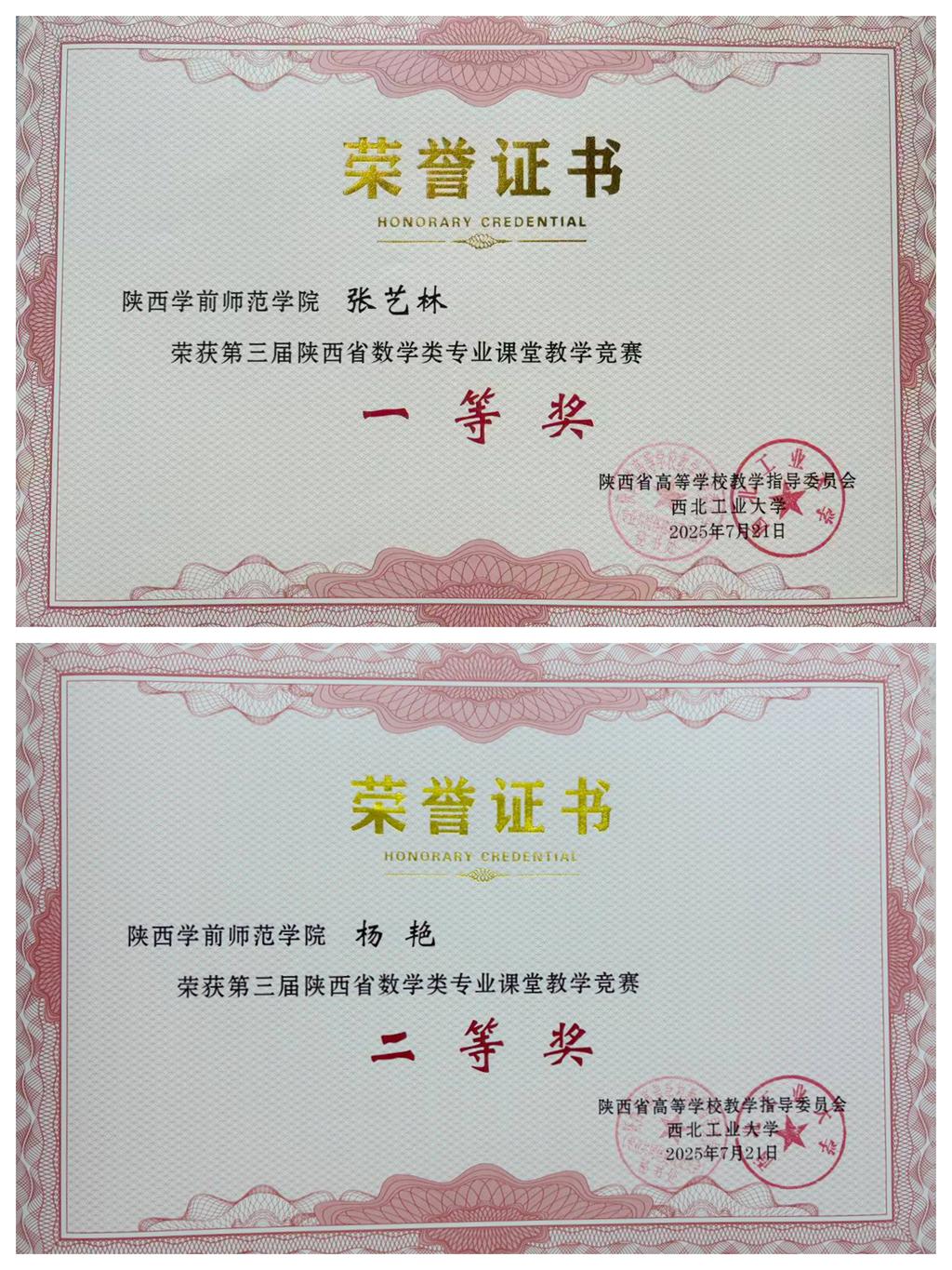 近日,在第三届陕西省数学类专业课堂教学竞赛和第五届陕西省大学数学课程教学创新竞赛上,数学与统计学院教师张艺林荣获数学类专业课堂教学竞赛一等奖,杨艳荣获二等奖;张艺林和张彦分别荣获大学数学课程教学创新竞赛三等奖。