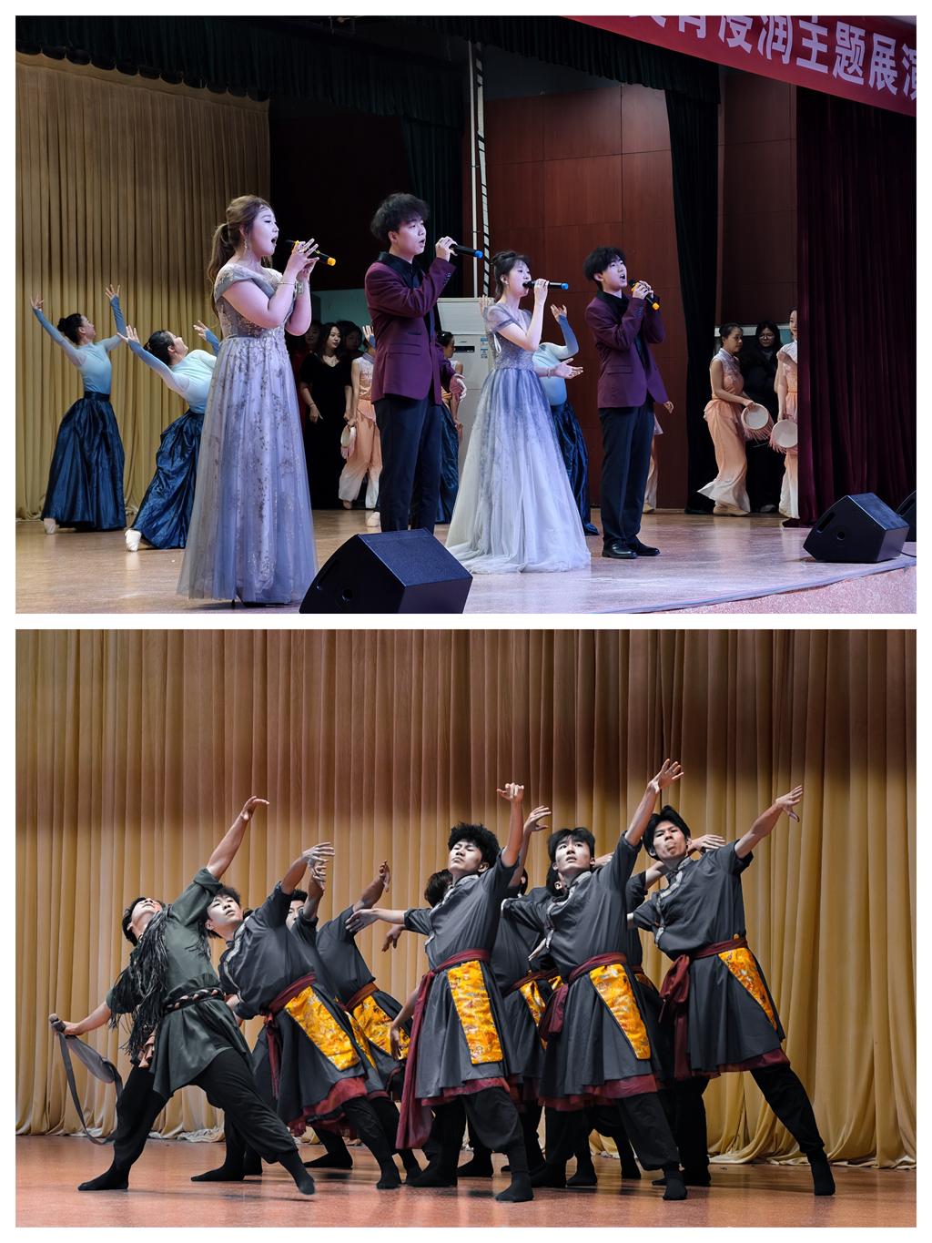 整场展演涵盖器乐、声乐、舞蹈、朗诵等多种艺术形式,18个节目层层递进,既展现金戈铁马的豪迈,又流露小桥流水的温婉。器乐合奏《盛世国乐》拉开千年国乐的悠扬旋律,点燃全场氛围,古筝重奏《党的光辉照我心》用国乐语言传递红色温情。盛唐风韵的独舞《拓枝舞芳华》、草原风情的笛子独奏《牧民新歌》、灵动活泼的群舞《春嬉》等节目,展现学子们扎实的专业功底;《战士为国守安详》《灯火里的中国》等声乐作品,深情演绎诠释家国情怀;朗诵《大河江山 寸土不让》将现场气氛推向高潮,彰显了青年学子的责任担当。节目在歌伴舞《我爱你中国》中落下帷幕,全场齐声合唱,抒发对祖国的赤诚热爱。