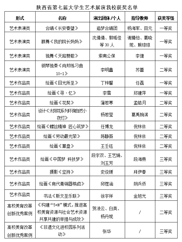近日,陕西省教育厅公布了第七届大学生艺术展演活动评选结果。best365官网师生在本届艺术展演活动中取得优异成绩,共获奖19项,其中艺术表演类一等奖3项,二等奖1项;艺术作品类一等奖2项,二等奖5项,三等奖4项;高校美育改革创新优秀案例二等奖2篇;优秀创作奖2项。学校再次荣获优秀组织奖。合唱作品《长安春望》被推荐代表陕西省参加全国展演。