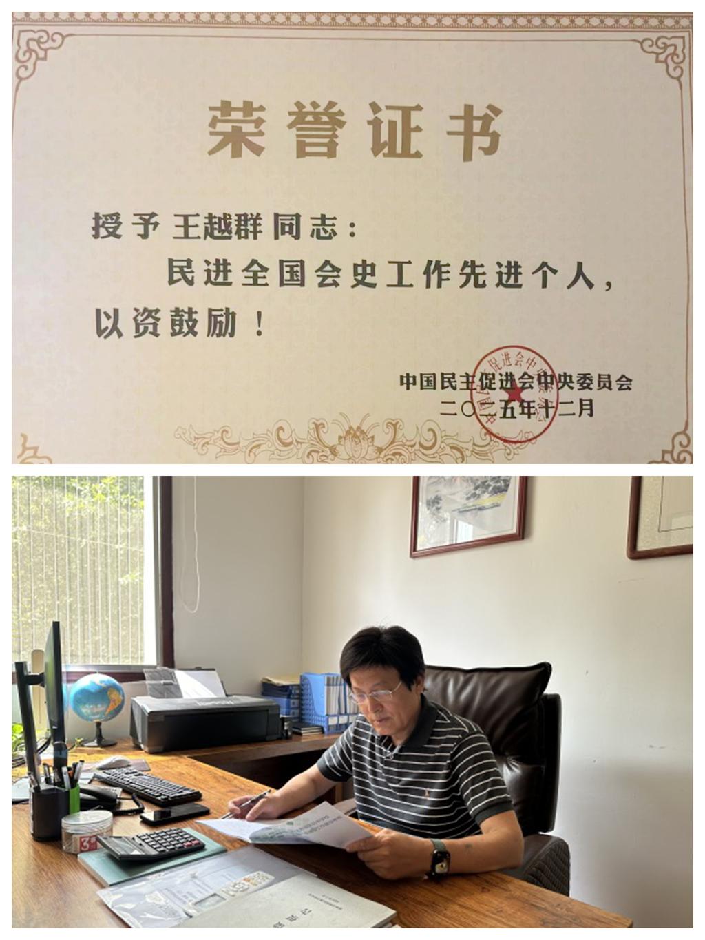 2025年是民进会史工作主题年,民进中央把庆祝民进成立80周年与主题年建设任务紧密结合,在会史学习教育、会史宣传普及、会史编写、会史研究等方面取得了显著成绩,涌现出一批先进集体和先进个人。学校民进总支主委、民进陕西省委会提案委员会主任王越群教授在此项工作中获得2025年“民进全国会史工作先进个人”荣誉称号。