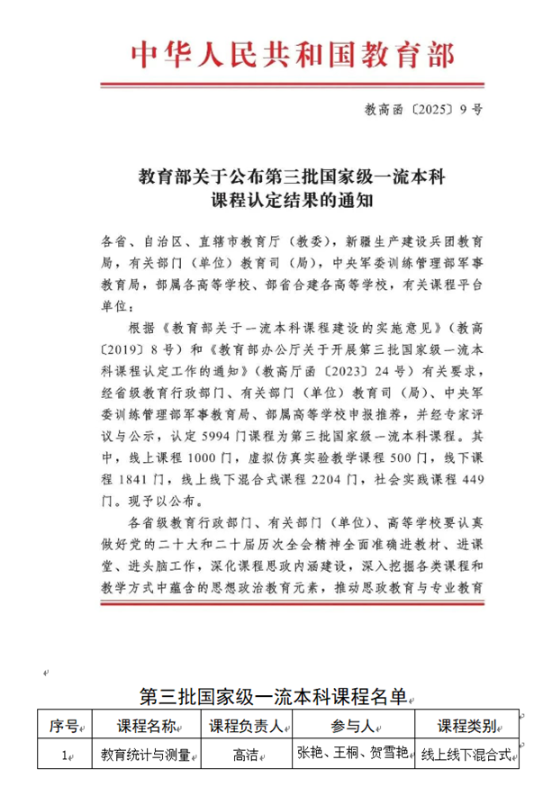 近日,教育部发布《关于公布第三批国家级一流本科课程认定结果的通知》(教高函〔2025〕9号),学校教育科学学院高洁副教授主讲的《教育统计与测量》课程成功入选。