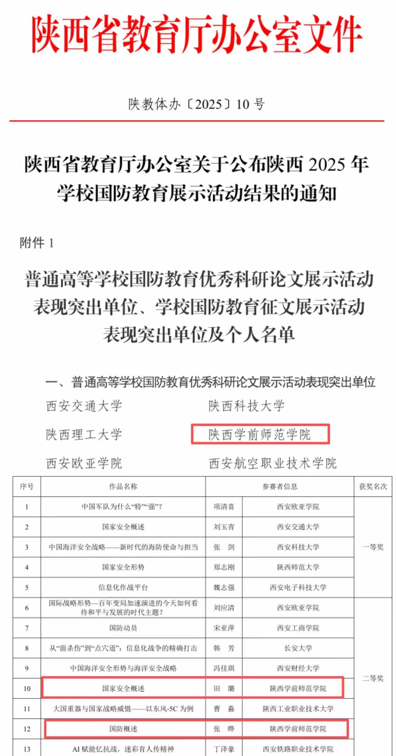 近日,由陕西省教育厅主办的陕西2025年学校国防教育展示活动圆满落幕。学校教育科学学院党委副书记张晔《国防概述》,党委学生工作部少数民族辅导员田璐《国家安全概述》两部作品荣获省级高校组二等奖(二等奖共8名),学校喜获“普通高等学校国防教育优秀科研论文展示活动表现突出单位”荣誉(该荣誉在全省仅授予 6 所高校),实现了学校在该项省级国防教育赛事中零的突破。