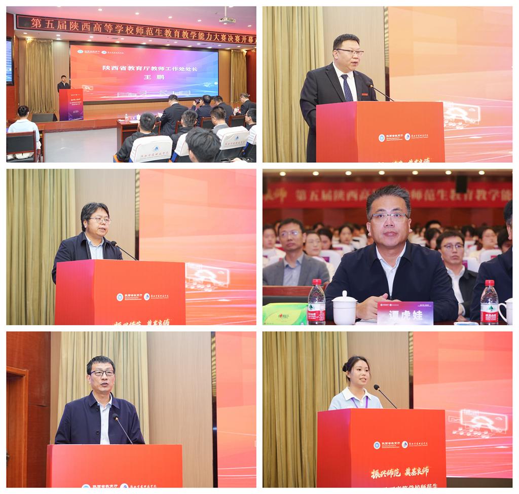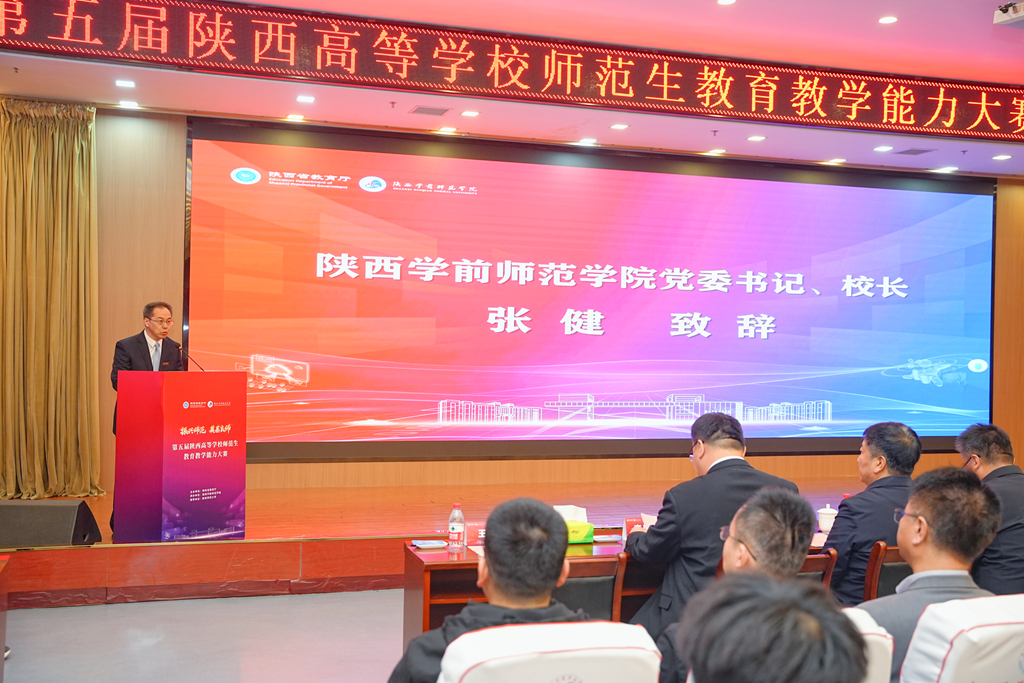 张健在致辞中介绍了学校的历史沿革、办学定位、培养特色和发展成就。他表示大赛的承办是彰显学校师范办学特色、激活未来教师队伍新生力量、服务陕西基础教育发展的责任与荣幸。学校在赛事组织、服务接待、后勤保障、环境营造等方面精心筹备,期待在这个“展示教学风采、锤炼教学技能、交流育人经验”的赛事平台上,各位选手能够践行教育初心、磨砺育人本领,展现新时代青年学子良好风貌,为推动陕西基础教育高质量发展贡献师范力量。