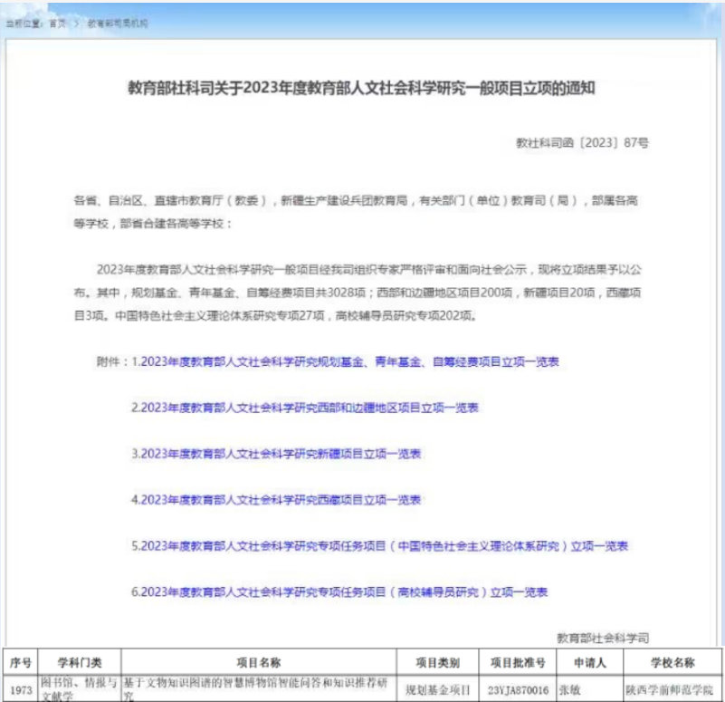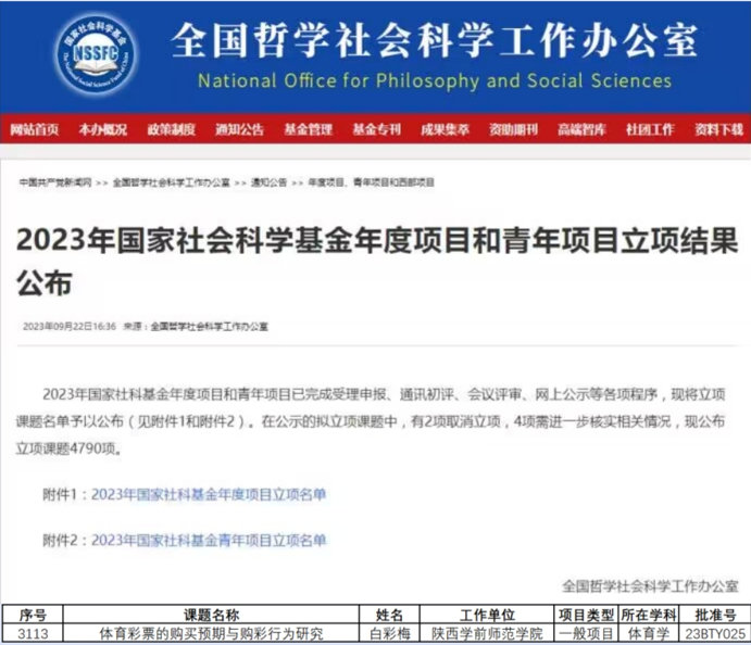 近日,全国哲学社会科学工作办公室发布了《2023年国家社会科学基金年度项目和青年项目立项结果公布》,best365官网体育学院白彩梅博士申报的《体育彩票的购彩预期与购彩行为研究》立项2023年国家社科基金一般项目(批准号:23BTY025)。教育部社科司发布了《教育部社科司关于2023年度教育部人文社会科学研究一般项目立项的通知》(教社科司函〔2023〕87号),best365官网信息工程学院张敏博士申报的《基于文物知识图谱的智慧博物馆智能问答和知识推荐研究》立项2023年教育部人文社会科学研究规划基金项目(批准号:23YJA870016)。