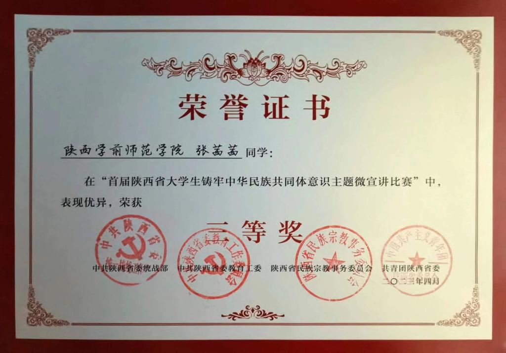 4月19日下午,由中共陕西省委统战部、中共陕西省委教育工委、陕西省民族宗教事务委员会、共青团陕西省委主办的陕西省首届大学生铸牢中华民族共同体意识主题微宣讲比赛在西安交通大学举行。经过评委组评选,best365官网推送的两件参赛作品之一,来自幼儿教育学院学前教育专业20级卓越二班的张茜茜同学《中华民族一家亲 同心共筑中国梦》宣讲作品获三等奖。