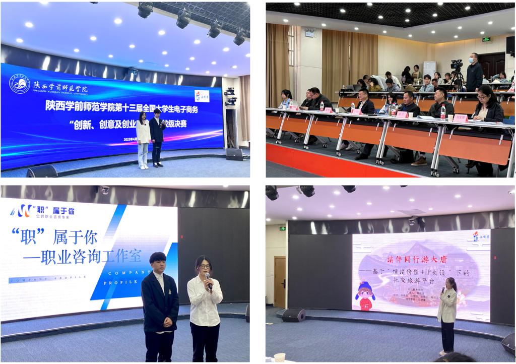 经过前期材料审核和校级复赛,共有17支队伍进入校级决赛(其中包括常规赛队伍14支,实战赛队伍3支)。参赛作品内容涉及非遗传承、生态农业、文创产品、新型电子商务平台、跨境电商和社交电商等方面。决赛分为项目路演和答辩两个环节,17个项目团队依据抽签顺序一一进行路演,并接受评委的现场提问。比赛中,参赛队伍依次介绍了团队项目概况、商业模式、竞争分析等,专业评委老师从创新能力、创意能力、实践活动、演讲情况、文案资料等方面进行全方位项目评价,对各个项目提出了建设性意见,为项目实施落地提供了有益参考。最终《“职”属于你——大学生职业咨询工作室》、《结伴同行游大唐——基于“情绪价值+IP创设”下的社交旅游平台》、《乾州布艺锦绣传承民间故事创新设计》三个项目名列三甲。