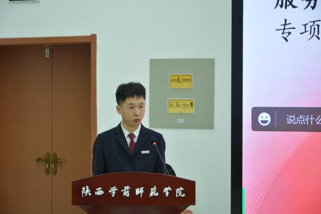 西部计划优秀志愿者代表李佳祥(现服务于汉中团市委,文学院2022届毕业生)、潘旺(现服务于宝鸡市渭滨区人民检察院,经济与管理学院2022届毕业生)、毋凡(现服务于新疆生产建设兵团第三师图木舒克市住房和城乡建设局,美术学院2022届毕业生)、李明玮(现服务于新疆生产建设兵团第二师铁门关市第24团党政办公室,幼儿教育学院2022届毕业生)四位同学分别以现场分享和视频连线的方式与在座的师生分享了个人在参加“西部计划”志愿服务这一年的经历与收获。李佳祥同学通过四个关键词:选择、转变、收获、传承,分享了自己在工作中的成长故事;潘旺同学详细地介绍了西部计划的项目内容,并结合自身经历解读了西部计划项目政策、经济待遇和福利保障等多方面信息,同时给学弟学妹们提出了一些建议;毋凡同学和李明玮同学通过线上视频连线的方式,同在座师生讲述了她们在新疆生产建设兵团志愿服务的经历以及所在地的工作环境、物产特色、民俗风情,并欢迎学弟学妹们积极参加西部计划,去往西部屯垦戍边,开启追逐西部梦的旅程。四位西部计划优秀志愿者对青春梦想的执着坚守、对西部建设的真情奉献、对志愿精神的深刻诠释,深深打动了在场的每个人,让同学们深切体会到“奉献、友爱、互助、进步”的志愿服务精神,引起了大家的强烈共鸣。