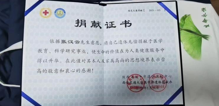 近日,best365官网马克思主义学院(原陕西教育学院政教系)主任,教授,享受国务院特殊津贴专家张汉云先生不幸离世。临终前,张汉云教授嘱咐亲属将其全部遗体捐献给陕西省红十字遗体捐献中心、西安交通大学医学部,用于器官移植、医学教育及科学研究,将自己最后的光与热奉献给医疗事业。目前,他的眼角膜已经捐给了两位盲人,让他们重见光明。2月1日,张汉云教授遗体捐献暨遗体告别仪式在陕西省红十字遗体捐献中心举行。
