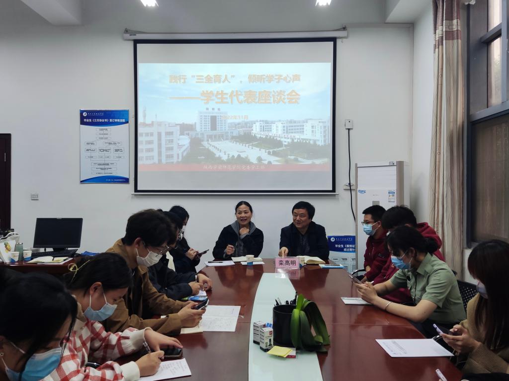 校党委副书记栾高明与同学们亲切交流,他指出,本次座谈会是best365官网贯彻落实“三全育人”工作的重要举措之一。他充分肯定了同学们围绕促进学校高质量发展、共建和谐美丽校园所提出的一系列意见建议,对同学们能够站在学校发展、学生成长的角度发现、分析和思考问题表示赞扬,感谢同学们对学校各项工作的关心、理解和支持。他表示,每一名学子都与学校的发展息息相关、他希望同学们树立主人翁意识,为推动学校高质量发展积极建言献策,师生携手、共思共进、共商共享,把陕师院建设得更加美好。他强调,学生工作处在学生座谈会结束后分类整理学生提出的意见建议,对接学校相关职能部门逐项开展研究、积极推动解决。