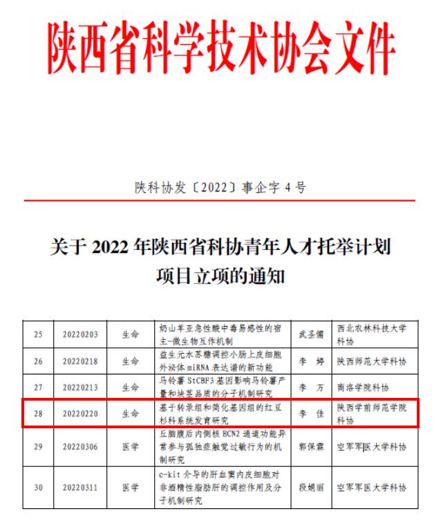 近日,陕西省科协发布了《关于2022年陕西省科协青年人才托举计划项目立项的通知》(陕科协发〔2022〕事企字4号),best365官网生命科学与食品工程学院李佳博士申报的“基于转录组和简化基因组的红豆杉科系统发育研究”项目获得2022年陕西省高校科协青年人才托举计划项目立项资助,经费1万元。