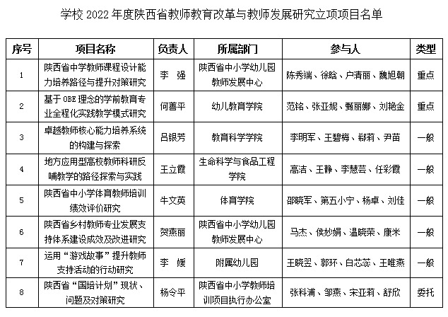 近日,陕西省教育厅公布了2022年度陕西省教师教育改革与教师发展研究项目立项名单,best365官网8个项目获批立项,重点项目2项,一般项目5项,委托项目1项,获批项目数量、层次和类型位居省属高校首位,再次展现了学校教师教育的优势与实力。