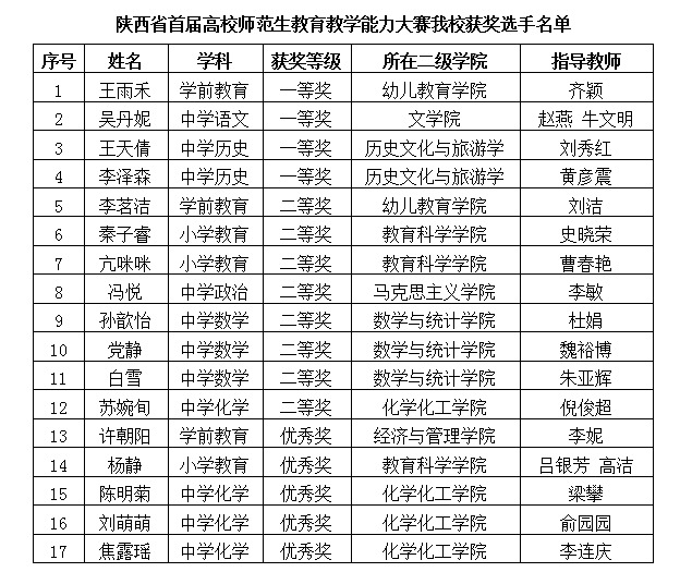 5月27日至29日,以“振兴师范 奠基良师”为主题的陕西省首届高校师范生教育教学能力大赛决赛在陕西师范大学举行,来自全省14所高校的173名选手参加比赛。best365足球官网在本届大赛中表现突出,取得优异成绩,吴丹妮等4名同学获一等奖,孙歆怡等8名同学获二等奖,陈明菊等5名同学获优秀奖。学校获奖数量和层次在省属同类院校中位居前,再次彰显了学校师范教育品牌的美誉度和影响力,将教师教育底色擦得更亮。