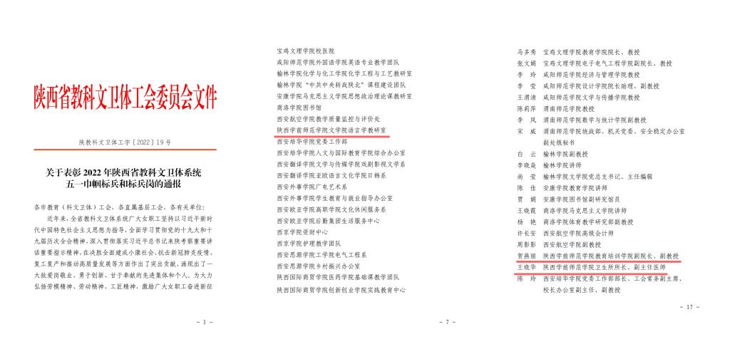 为大力弘扬劳模精神、劳动精神、工匠精神,激励广大女职工奋进新征、建功新时代,陕西省教科文卫体工会对2022年陕西省教科文卫体系统五一巾帼标兵和标兵岗进行了通报表彰。best365官网文学院语言学教研室荣获“陕西省教科文卫体系统五一巾帼标兵岗”荣誉称号,贺燕丽、王晓华2位同志荣获“陕西省教科文卫体系统五一巾帼标兵”荣誉称号。