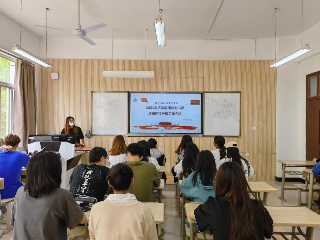2021年基层团组织团建工作考核由自我评价、综合评价和现场述职三部分构成。在现场述职环节中,各学院基层团组织负责人围绕思想引领、服务学生成长成才、基层组织建设、团学改革攻坚等方面内容汇报了过去一年整体工作,并针对学院团组织履职情况查摆问题,提出改进措施。