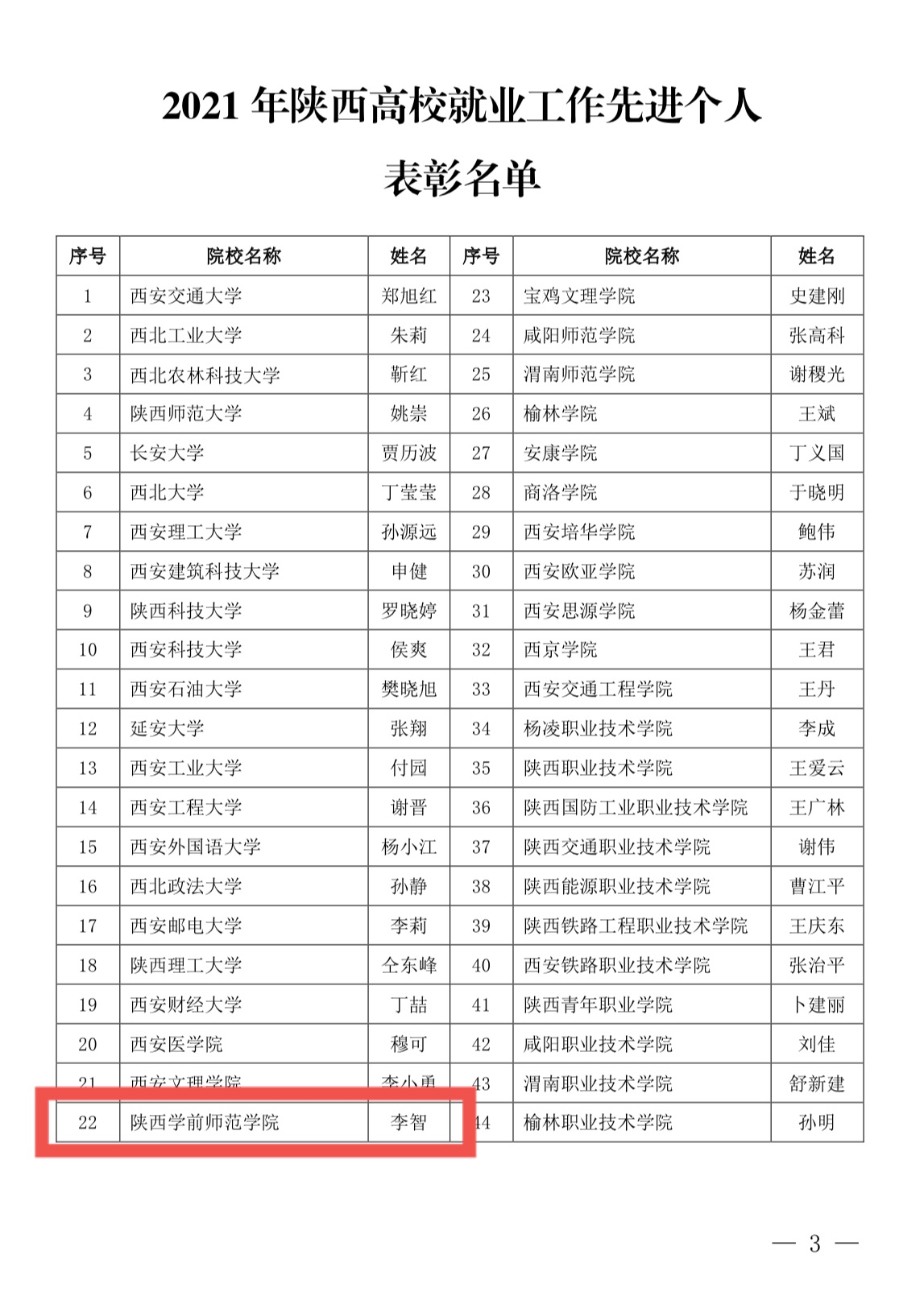 近日,陕西省高等学校毕业生就业服务中心发文关于表彰2021年陕西省高校就业工作先进单位和先进个人的通知,best365官网党委学生工作部就业指导服务中心李智、高美分别荣获先进个人和优秀信息员,马克思主义学院白艳荣获优秀工作者。