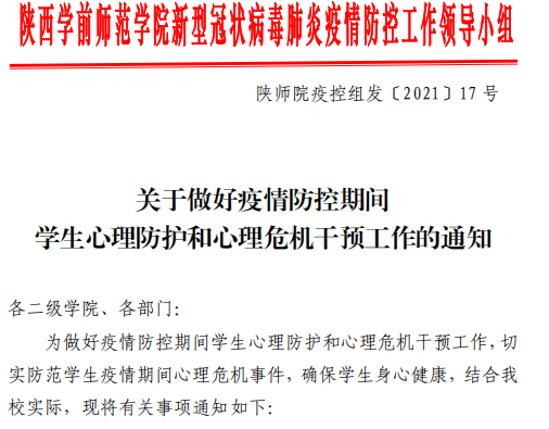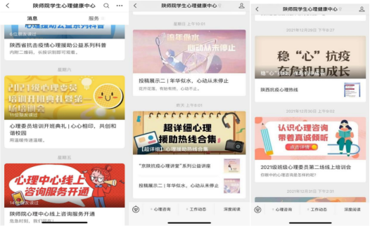 利用微信公众号“陕师院学生心理健康中心”、“师院学工”、学生工作群,心理咨询中心网站和班级心理委员群等网络平台持续发布疫情心理健康知识和心理调节技巧,名家心理健康教育讲座,帮助学生科学了解疫情中的心理应激特点,引导学生树立健康防疫理念、学会正向思维方式。发布陕西省教育系统、华中师大抗疫心理援助热线、清华援秦抗疫心理咨询热线等专业心理援助平台,更专业、全方位、多时段地守护学生心理健康。