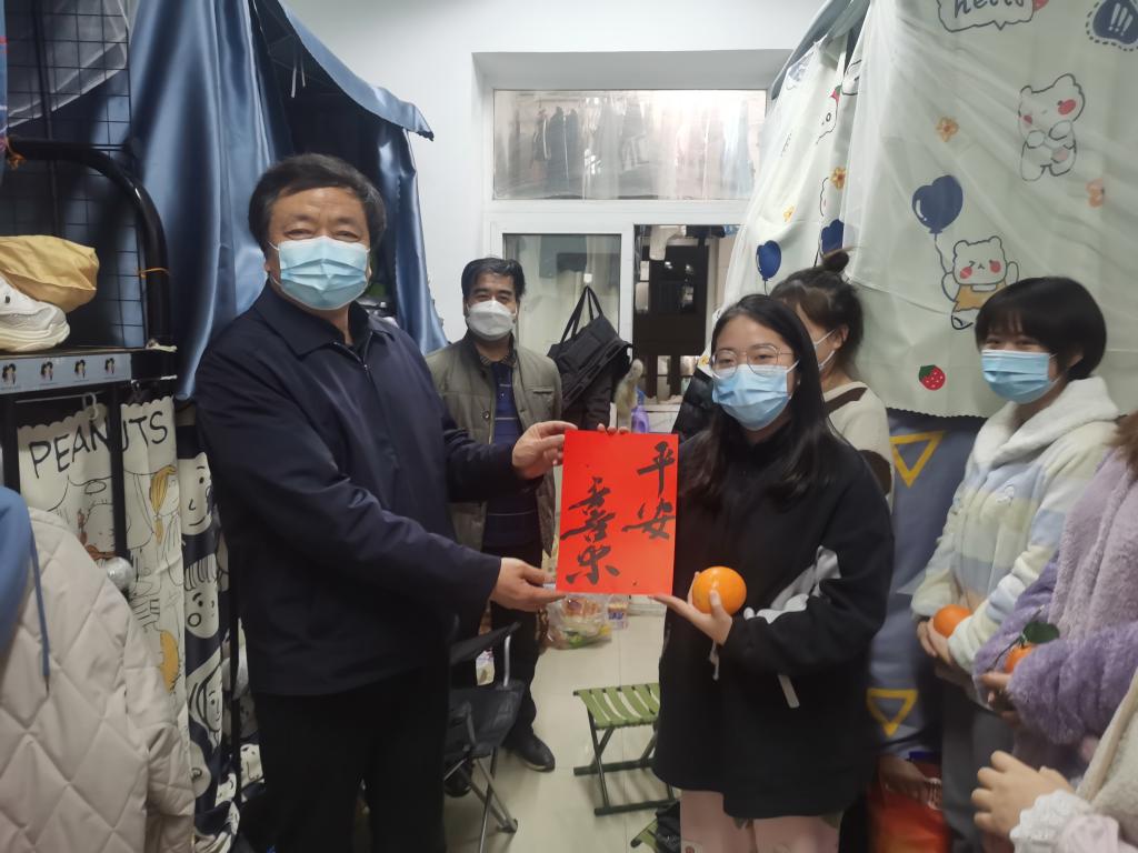 在同学们线上欢聚期间,校党委副书记栾高明带领美术学院院长金旭光、副书记(主持工作)文竹以及辅导员老师看望慰问了学生,与同学们共度新年。栾书记与学生们亲切地交流,深入了解学生们的思想、学习、生活情况及需求,认真倾听他们的心声,并致以亲切的节日问候。在新年来临之际,栾书记专程为学生们送去了橙子和桔子,祝愿同学们在新的一年里心想事“橙”,吉祥如意。栾书记希望同学们能够理解学校疫情防控政策的要求,自觉遵守疫情防控期间校园管理各项规定。他叮嘱同学们要做好个人防护,非必要不外出,不聚集。注意劳逸结合,合理安排好学习和生活,上好网课,加强锻炼。宿舍内要注意用电安全,保持良好的卫生环境。同学们要经常与家人联系,介绍自己在学校的学习和生活,让家人放心。学校会努力解决同学们学习生活中的困难,全力以赴为同学们的健康安全保驾护航。他提到在疫情防控时期,美术学院的学生们能够发挥专业特长,在宿舍用笔、用字、用画为疫情防控工作助力加油,用艺术凝聚了人心,增强了信心,同学们积极地投入到志愿者队伍中,用自己的实际行动诠释了新时代青年大学生对疫情防控的初心使命和责任担当。线上的欢乐团聚,线下的温暖慰问,把晚会推向了高潮。