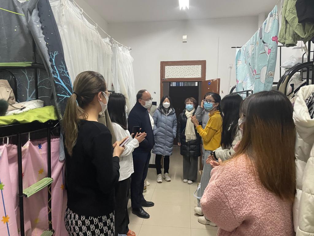 为了进一步做好疫情防控工作,了解学生封闭宿舍期间的生活状况和思想动态,值2022年元旦之际,唐宏副校长携外国语学院院长张慧军、副书记(主持工作)高海燕、辅导员深入2020级学生宿舍,看望慰问学生,将思政课带入宿舍,与学生同跨年、共抗疫。