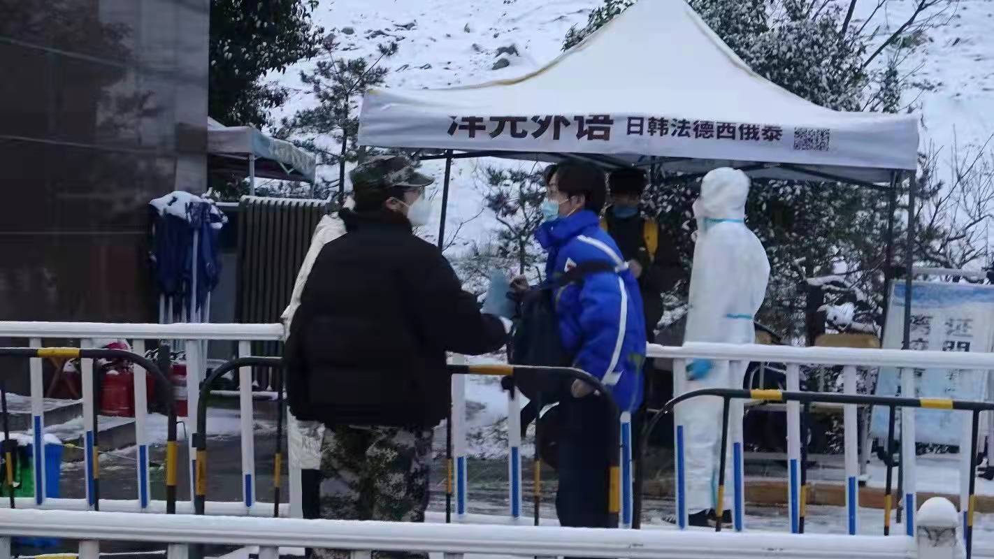 25日清晨,漫天飞雪令整个西安银装素裹,疫情之下辛苦备考的同学们正在体验一段不平凡的赴考之路。为了让每一名在best365官网考点参加考试的考生都能顺利参加考试,师院人尽心尽力为考生提供服务。亮码、测温,出示48小时核酸阴性证明、准考证和身份证、人脸识别,考生们进入考场的秩序有条不紊,开考情况平稳有序。志愿者们不畏寒冷,不畏风雪,用行动诠释了“疫情就是命令,防控就是责任”。
