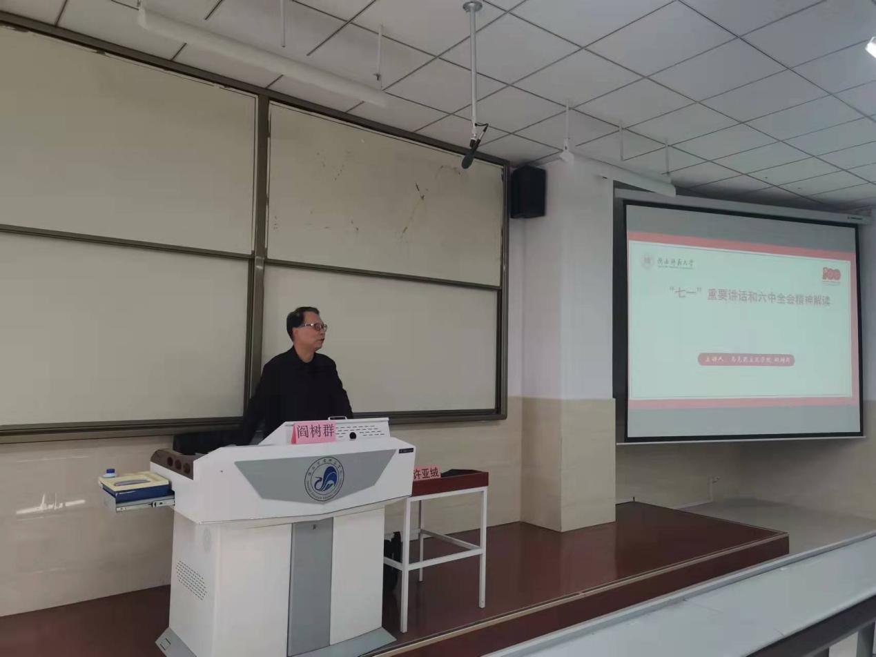 阎树群教授主要从三个部分介绍“七一”重要讲话和十九届六中全会精神:一、“七一”重要讲话和六中全会的关系;二、三个历史决议的关系;三、重大成就和历史经验。阎教授用幽默的语言、浅显易懂的历史故事、珍贵的图片资料,讲述了中华民族的奋斗史、分析了中国共产党带领中华民族取得胜利的重要意义和宝贵的历史经验。