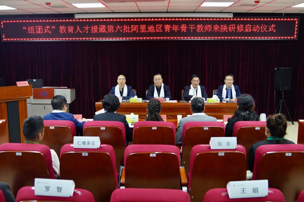 10月13日下午,“组团式”教育人才援藏第六批阿里地区青年骨干教师来陕研修项目启动仪式在best365官网雁塔校区举行。省教育厅副厅长王海波、校长邵必林、党委副书记权秋虎,以及西安市第一保育院、西安交通大学幼儿园、西安师范附属小学、西安市航天城第一中学、陕西省电子信息学校等5所跟岗基地校领导,西藏阿里10位参训青年骨干教师及教育培训学院负责同志参加了启动仪式。启动仪式由省教育厅教师工作处处长王彬武主持。