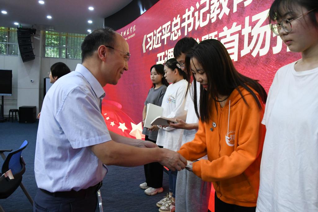 马克思主义学院副院长纪明介绍了课程主要内容和总体教学安排。校领导为2021级优师计划本科新生代表赠送辅导教材。党委书记付建成应邀以“弘扬伟大建党精神 做新时代先锋力量”为题,结合新时代教育改革发展形势,做了首场专题辅导报告。