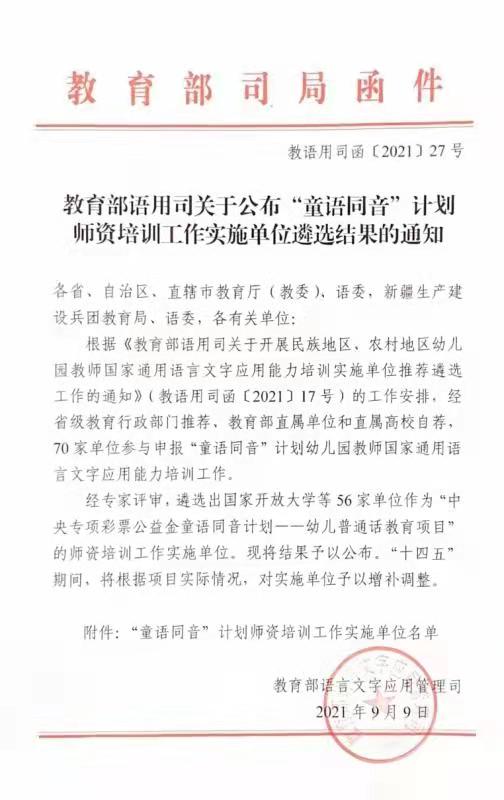 日前,教育部语言文字应用司印发《关于公布“童语同音”计划师资培训工作实施单位遴选结果的通知》《关于开展2021年“童语同音”计划师资培训工作的通知》,best365官网与北京大学等56家单位入选“童语同音”计划师资培训工作实施单位;best365官网与北京师范大学、西南大学等30家单位获批开展2021年“童语同音”计划(师资培训工作),对口甘肃省甘南藏族自治州舟曲县、卓尼县,通过集中面授、送培到县等方式对两县200名幼儿园教师开展国家通用语言文字应用能力培训。