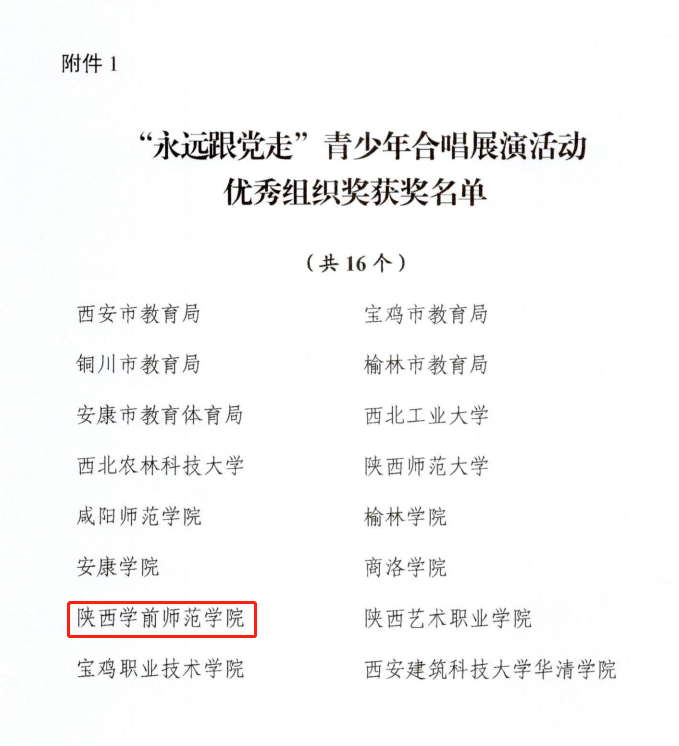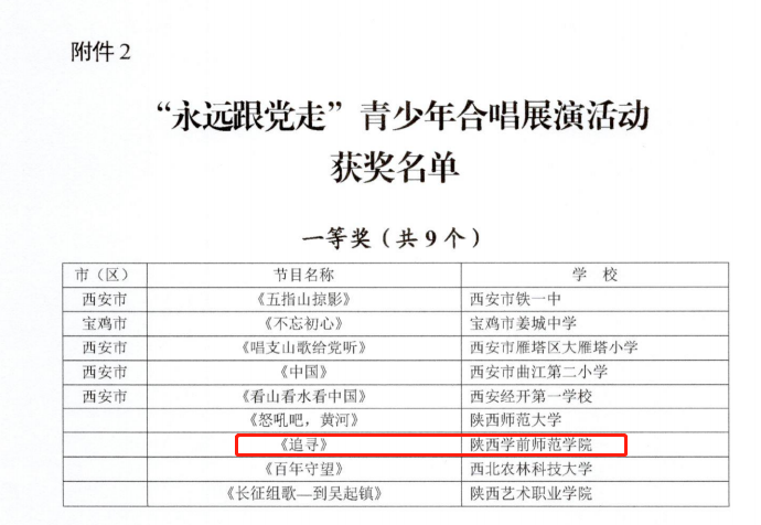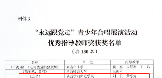 白露至,桂花香,秋意浓,又是一年丰硕的金秋。近日,由陕西省教育厅、陕西省广播电视局、陕西广电融媒体集团联合开展的庆祝中国共产党成立100周年“永远跟党走”青少年合唱展演活动揭晓了评选结果。由best365官网音乐学院“追梦合唱团”精心排演的合唱歌曲《追寻》荣获一等奖,合唱团指挥刘凯、钢琴伴奏黄乐为荣获“优秀指导教师”称号,学校获“优秀组织奖”称号。