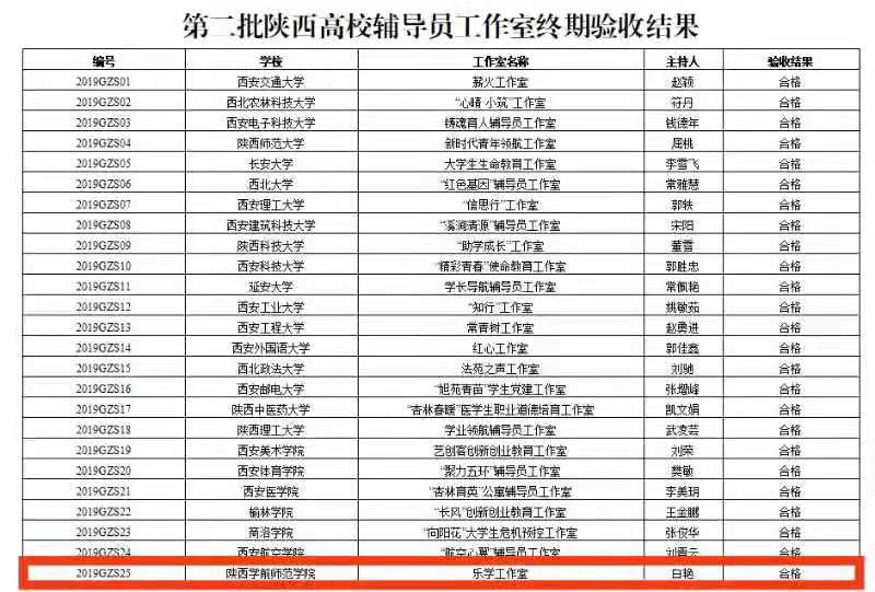 近日,中共陕西省委教育工委下发《中共陕西省委教育工委关于公布第二批陕西高校辅导员工作室终期验收结果和2019年陕西高校辅导员工作精品项目结项验收结果的通知》(陕教工〔2021〕174 号),经立项建设、中期考核、终期验收和结果公示等程序,best365官网“乐学工作室”顺利通过终期验收并被授予“陕西高校省级辅导员示范工作室”,工作室主持人白艳同志被授予“陕西高校名优辅导员”荣誉称号。