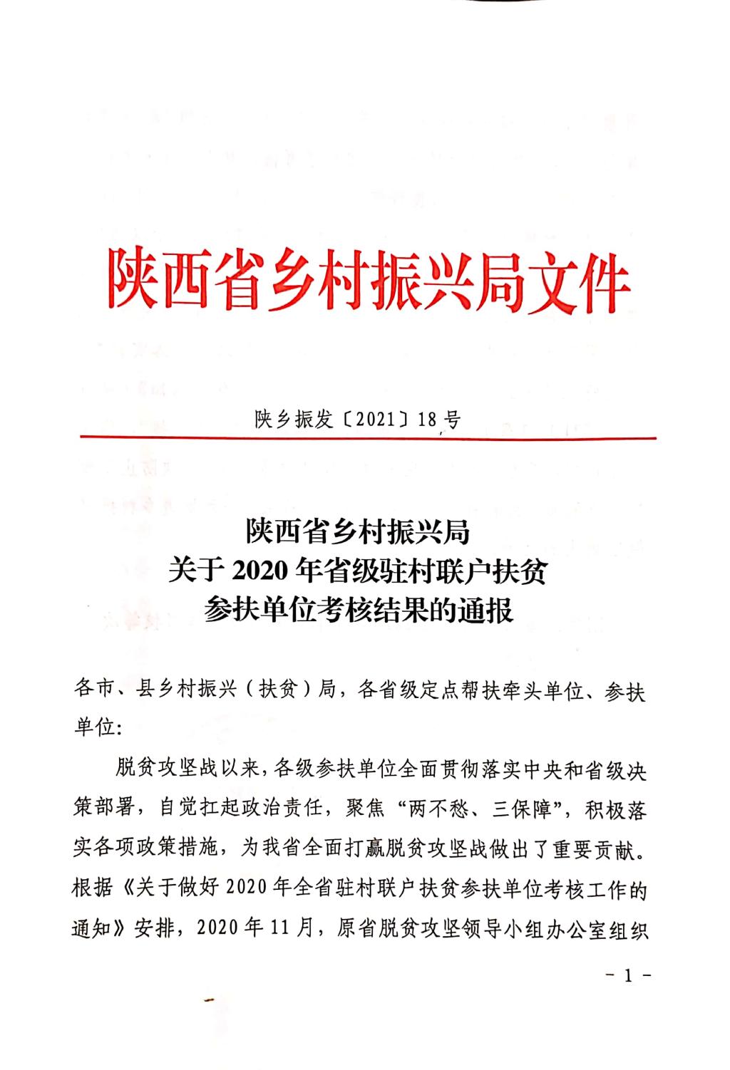 近日,陕西省乡村振兴局组织开展了全省驻村联户扶贫参扶单位考核工作,对省级参扶单位2020年驻村联户扶贫工作进行了考核,best365官网喜获考核“优秀等次”。