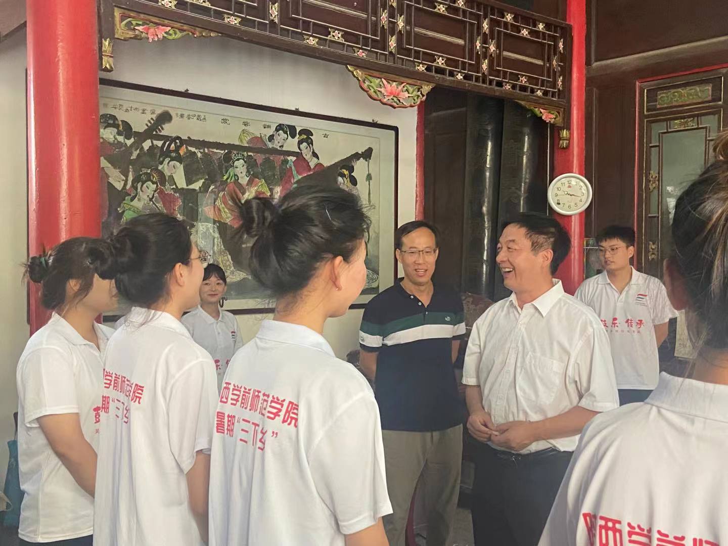 在秦风鼓乐社团暑期“三下乡”社会实践活动即将结束之际,7月29日上午校长邵必林、教务处长李明军一行顶着酷暑来到何家营鼓乐社,看望在此开展“鼓乐传承 美育乡村行”三下乡的学生。