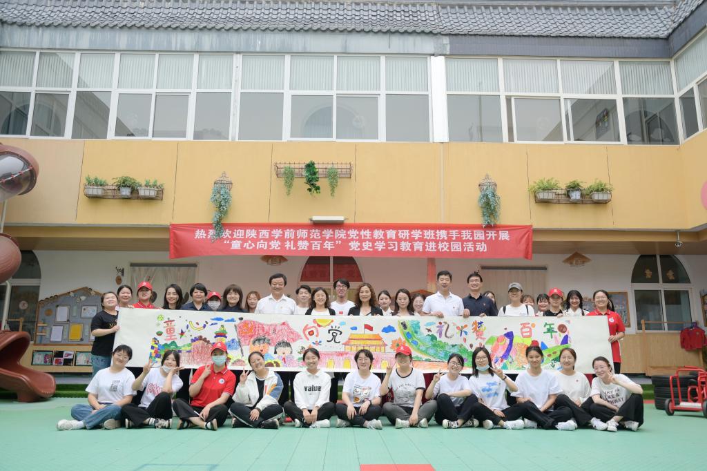 结束参观后,学员们来到了渭南市临渭区丰荫幼儿园,以讲述绘本故事、舞蹈歌唱、同画十米画卷等丰富多彩的形式,精心开展了“童心向党 礼赞百年”党史学习教育进校园活动。期间,看望了在丰荫幼儿园工作的3名校友,为幼儿园赠送了学教具和玩具。