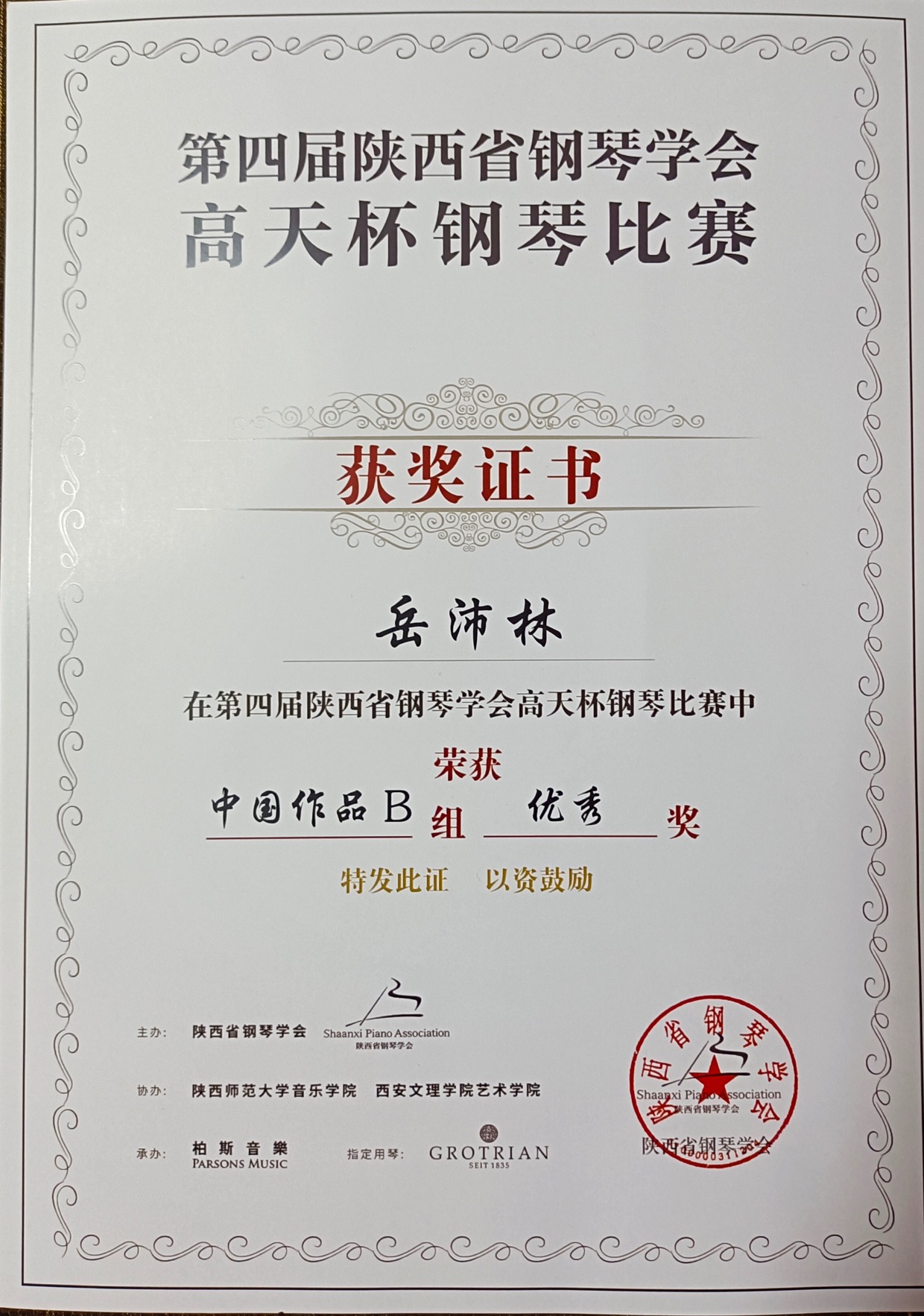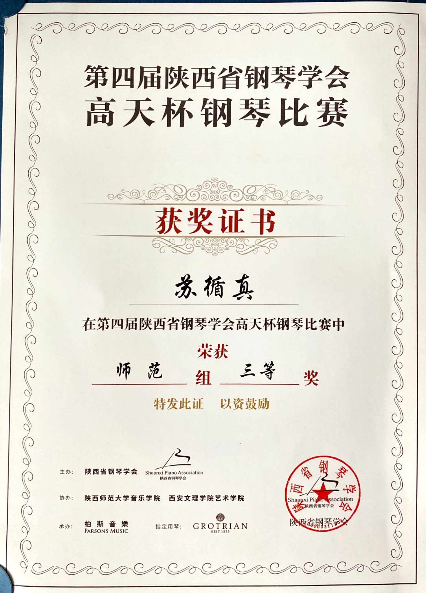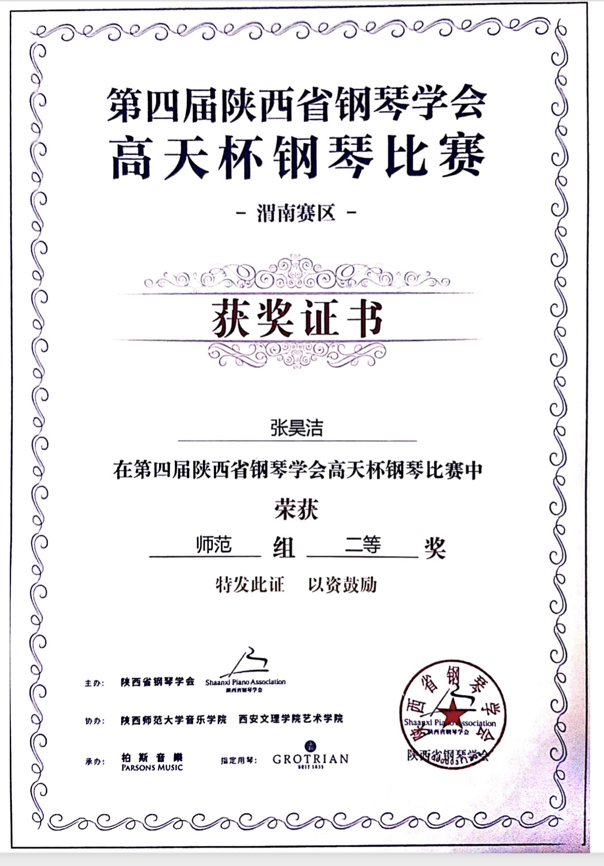 近日,由陕西省教育厅指导、陕西省钢琴学会主办,陕西师范大学、西安文理学院、柏斯集团等单位协办的第四届陕西省钢琴学会“高天杯”钢琴大赛在西安成功举行。经层层选拔,三轮赛制,best365官网参赛师生表现优异,最终,2019级音乐学本科张昊洁获得分赛区师范组二等奖,2017级音乐学本科苏循真获得师范组三等奖,2019级音乐学本科岳沛林获得中国作品组优秀奖,指导教师白艳、黄乐为获得优秀指导教师奖。