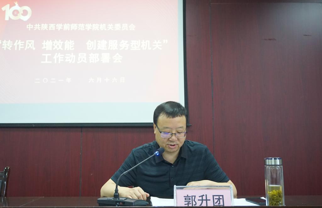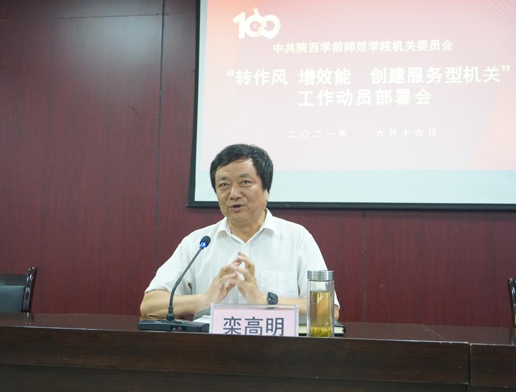 2021年6月16日上午,机关党委在德勤楼第五会议室召开“转作风增效能创建服务型机关”工作动员部署会,机关全体党员、干部共计140余人参加会议。校党委副书记栾高明作动员讲话,机关党委书记郭升团主持会议。
